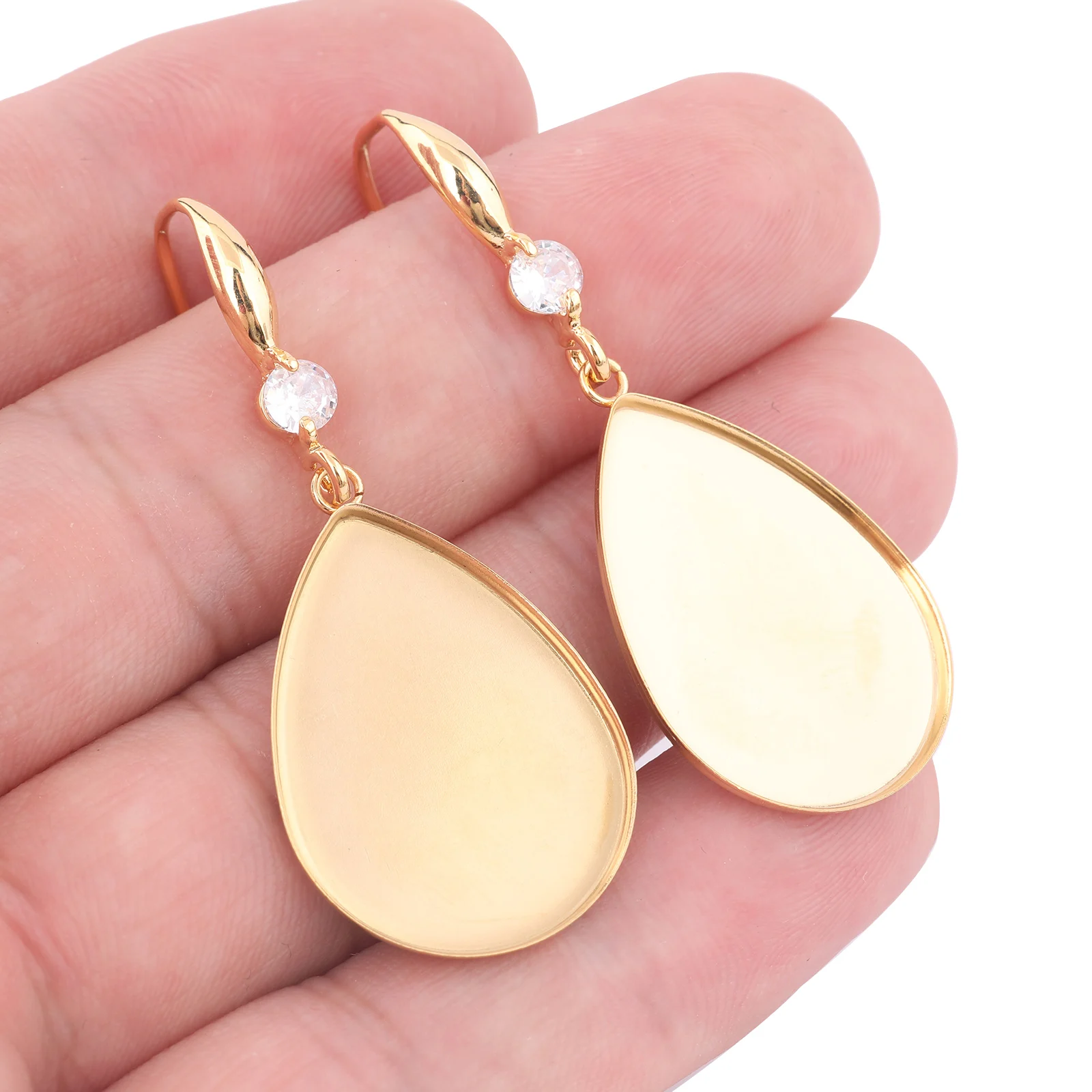 6pcs Gold Plated Zircon Stone Earring Hooks Findings 18x25mm Teardrop Cabochon Earring Base Setting Blanks Stainless Steel Diy