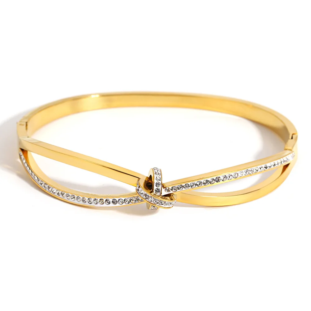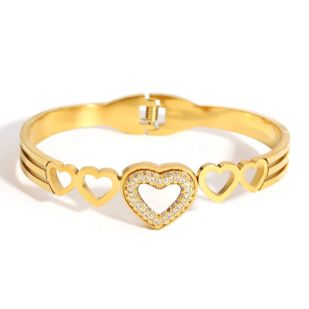 This elegant gold-plated stainless steel cuff bracelet features a chic design combining rhinestone stars, hearts, and bowknots, perfect for women who appreciate refined fashion. Crafted from high-quality, hypoallergenic stainless steel, it resists fading and offers comfortable all-day wear. Versatile for stacking or wearing alone, it complements any outfit—from weddings to everyday occasions. A thoughtful gift choice for wives, mothers, or loved ones, ideal for birthdays, anniversaries, and special celebrations. This timeless piece seamlessly blends style and durability for a sophisticated jewelry collection.