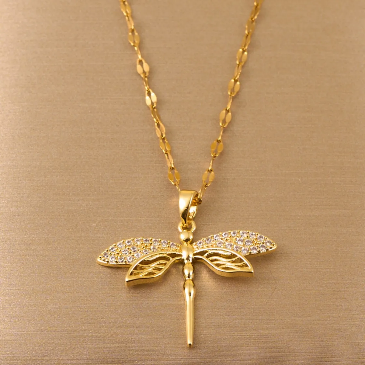 This elegant pendant necklace features a dragonfly design with inlaid zircon, crafted from gold-toned copper metal. Designed as a unisex fashion accessory, it hangs on a sleek snake chain, making it an ideal choice for party wear.This sophisticated piece combines delicate insect-inspired detail with refined materials, perfect for those seeking a distinctive and stylish addition to their jewelry collection.