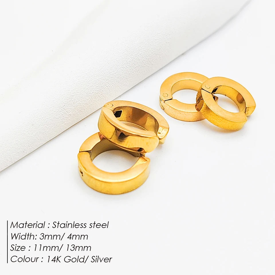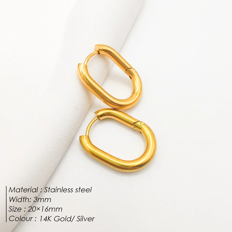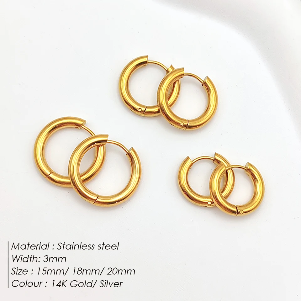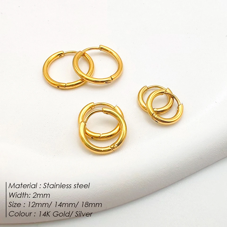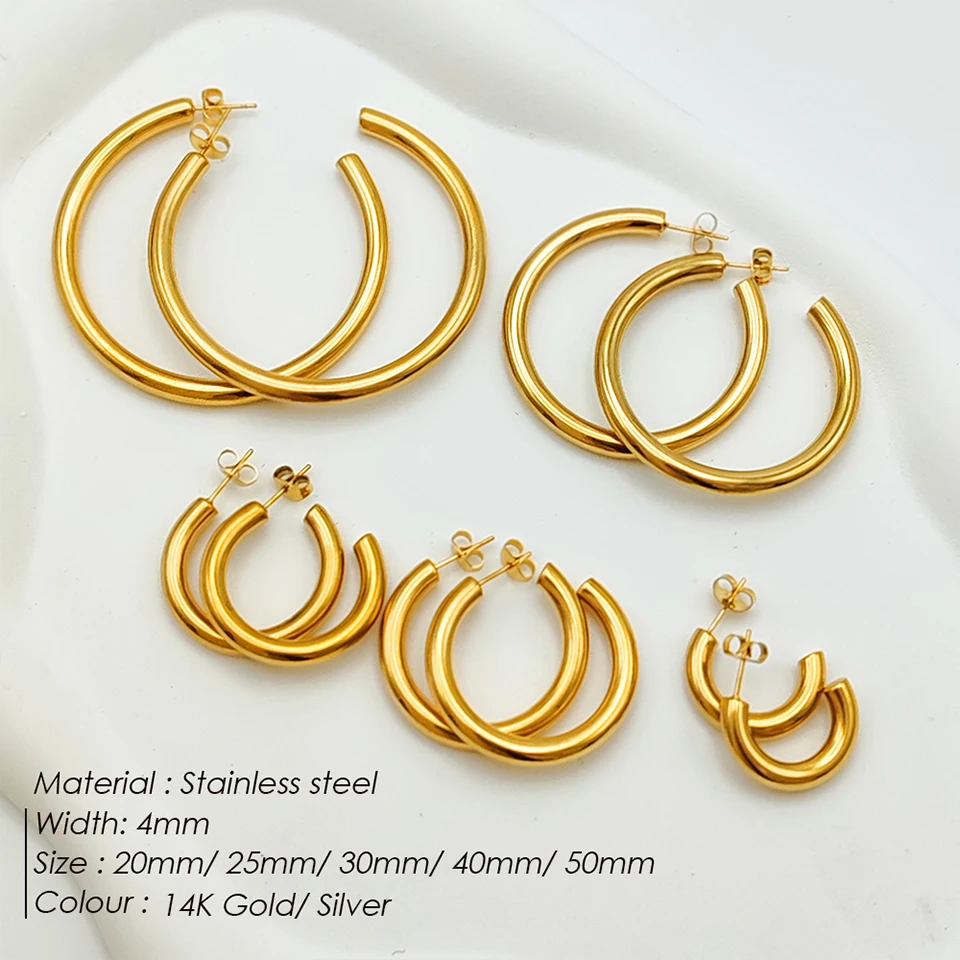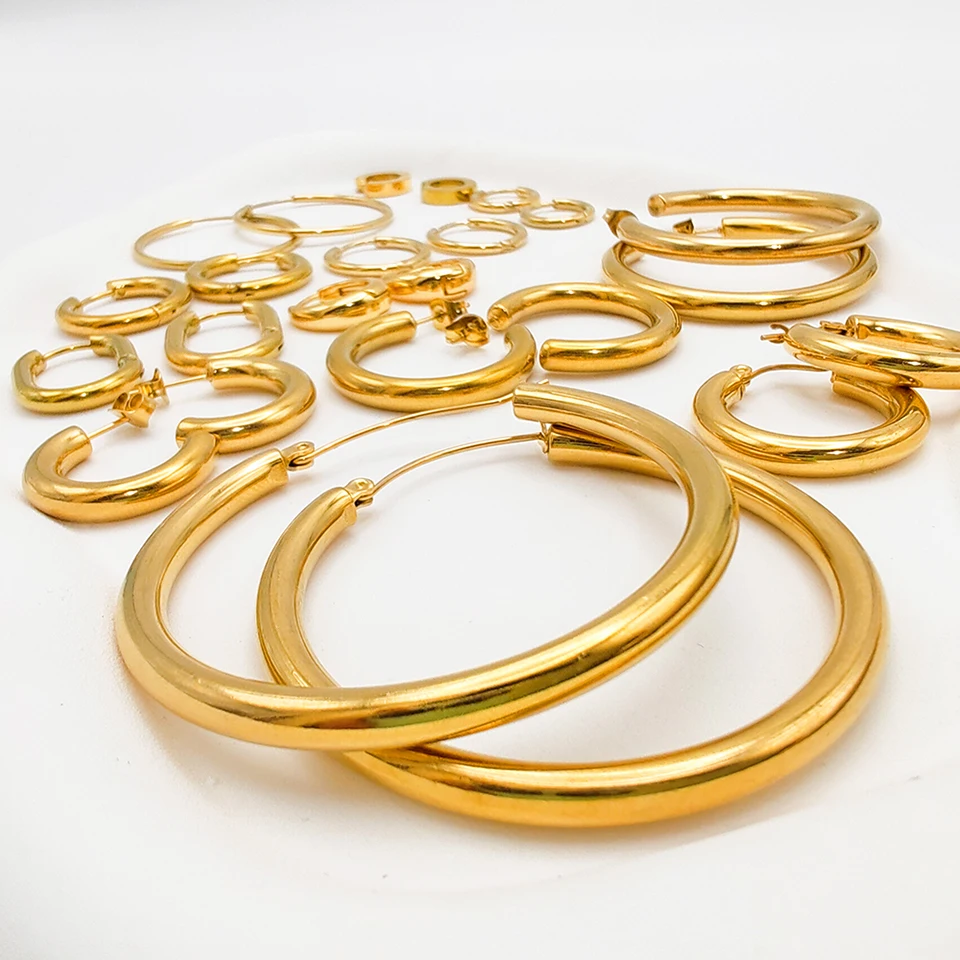 These stainless steel hoop earrings combine classic elegance with a bold design, available in gold and silver tones. Designed for women, they are durable and resistant to tarnishing, suitable for everyday wear including showers. Offered in multiple sizes from 20mm to 50mm, their striking round shape complements various styles from office to party settings. Perfect for those seeking trendy, statement jewelry with long-lasting quality. Wholesale options are available for larger orders.