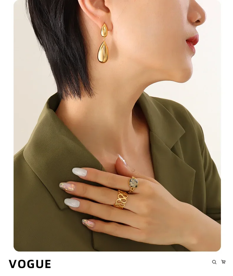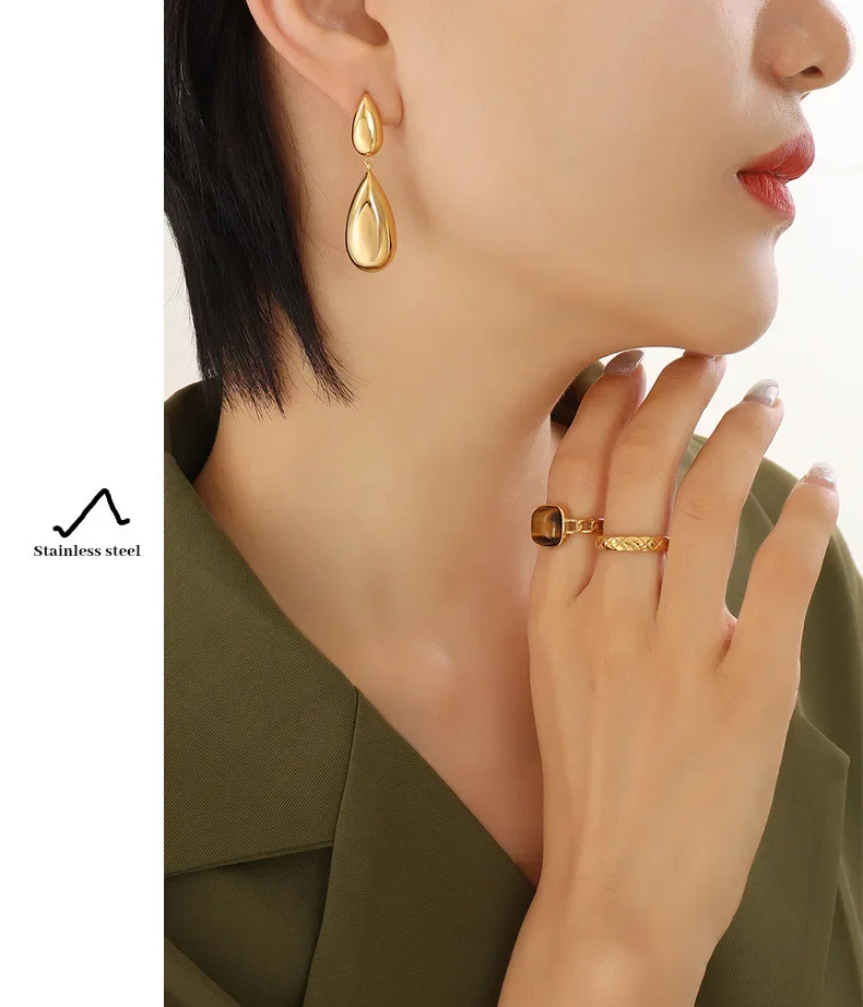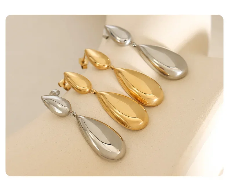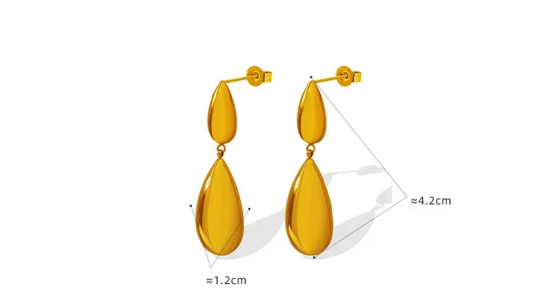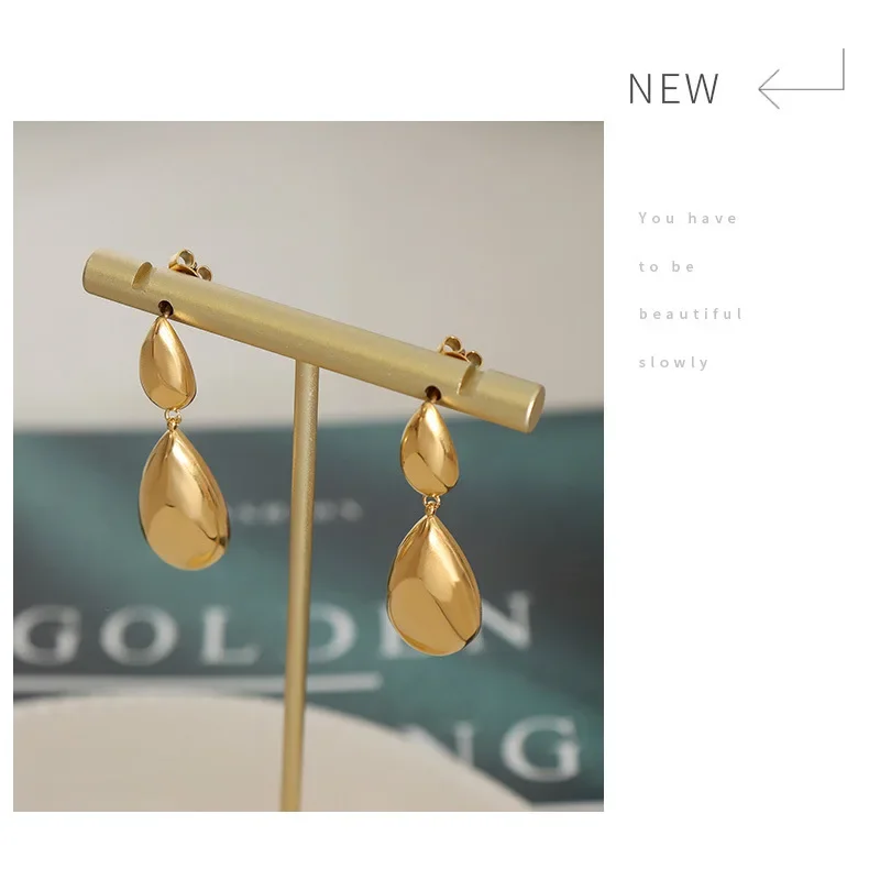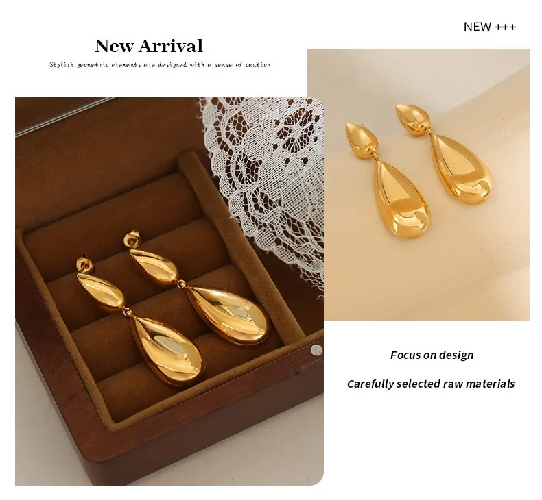 These earrings feature a distinct Japanese-inspired design that brings a refined and graceful touch to any look. Perfectly crafted for girls, they serve as an ideal accessory for young style lovers. Available as wholesale jewelry, they provide excellent value for bulk purchases, whether for resale or gifting. Made with durable titanium steel plated in 18K gold, these earrings are safe for sensitive skin. Their mix of large and small water drop pendants offers a striking contrast that instantly draws attention.