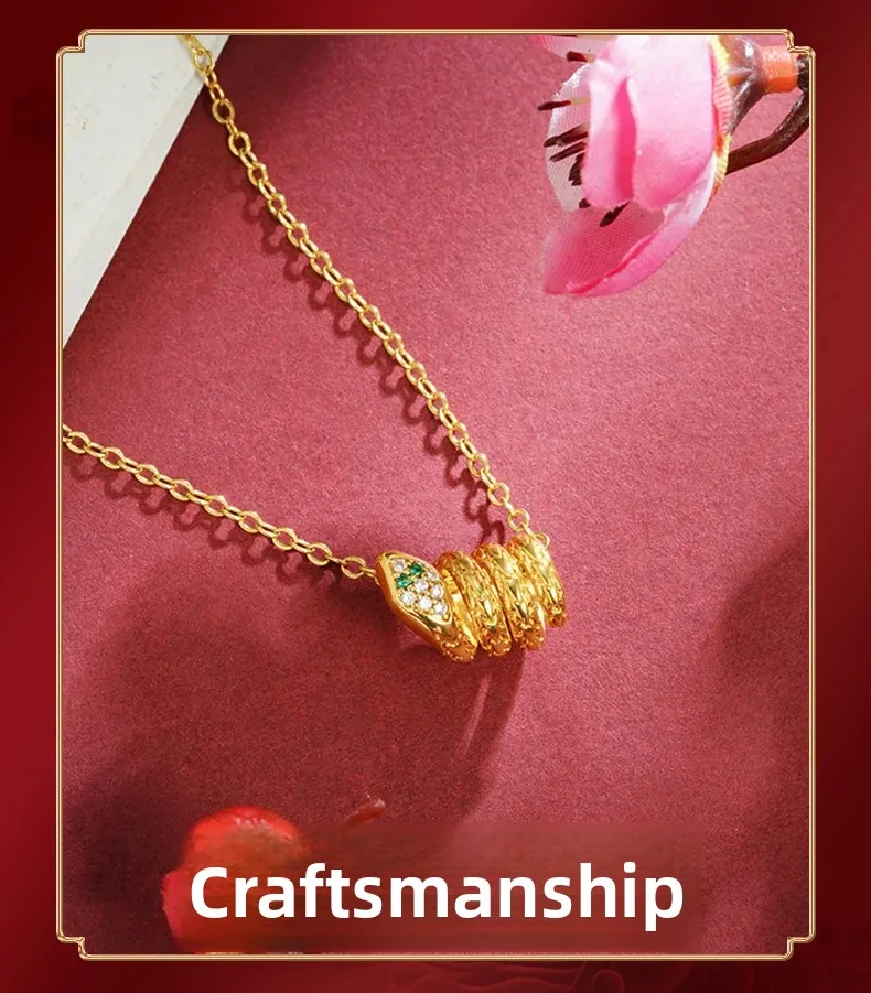 Crafted from gold-plated copper, this pendant ensures lasting color and durability. Featuring an elegant zirconium snake dance design, it brings a refined touch to any ensemble. It blends traditional craftsmanship with contemporary style. Its versatile design complements a wide range of occasions, from everyday wear to special events. The Vietnamese sand gold element adds a distinctive and captivating charm, making this piece a remarkable addition to your jewelry collection.